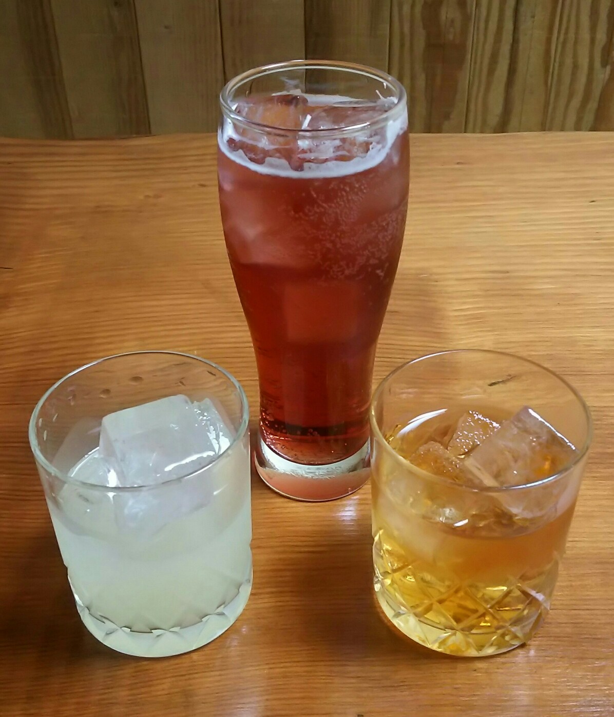 写真左は「ゆず酒のロック」 写真中は「ぶどうサワー」 写真右は「うめ酒のロック」